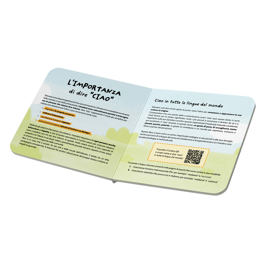 La parola “ciao” non è solo un saluto, ma uno dei primi modi con cui i bambini, fin da piccolissimi, entrano in contatto con gli altri. Non è un caso che salutare, attraverso un gesto della mano o pronunciando questa parola, sia una dei primi gesti sociali che i piccoli imparano e utilizzano ogni giorno. Ma ci sono tanti modi per dire “ciao”, a seconda della lingua parlata da chi la pronuncia. Questo libro è pensato per accompagnare il piccolo protagonista, e i lettori insieme a lui, in una “passeggiata” alla scoperta dei “ciao” delle varie lingue del mondo. Salutando i loro coetanei provenienti da altri Paesi, per i bambini sarà semplice e naturale comprendere come dire “ciao” non sia soltanto la base dell’educazione, ma anche un gesto di pace e di accoglienza tanto piccolo quanto potente. Scena dopo scena, questa camminata in città si trasforma in un’occasione per coltivare fin da piccolissimi l’inclusione e il senso di appartenenza a una società plurilingue e multiculturale, e per costruire un mondo sempre più rispettoso e pacifico.